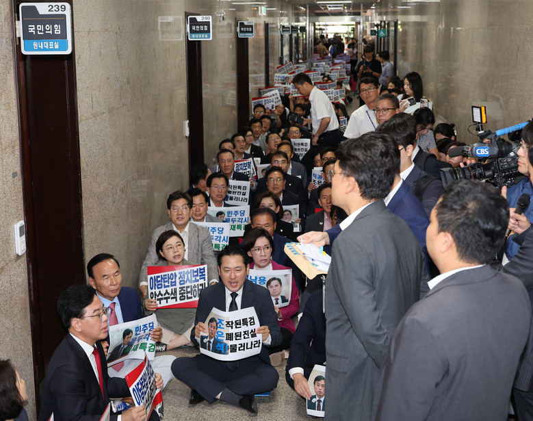 12·3 비상계엄 관련 내란 의혹 등을 수사하는 조은석 특별검사팀은 전날에 이어 이날도 국회 본청 원내대표실 등을 상대로 압수수색을 시도했다.특검 관계자들은 국회 사무처 직원들과 함께 원내대표실 앞으로 진입을 시도했으나 진을 치고 있던 의원들의 반발에 막혔다.의원들은 압수수색 대상 장소인 원내대표실과 원내행정국 앞 복도에서 의원총회를 열어 항의 피켓을 들고 연좌 농성을 벌이며 압수수색 집행을 저지했다.