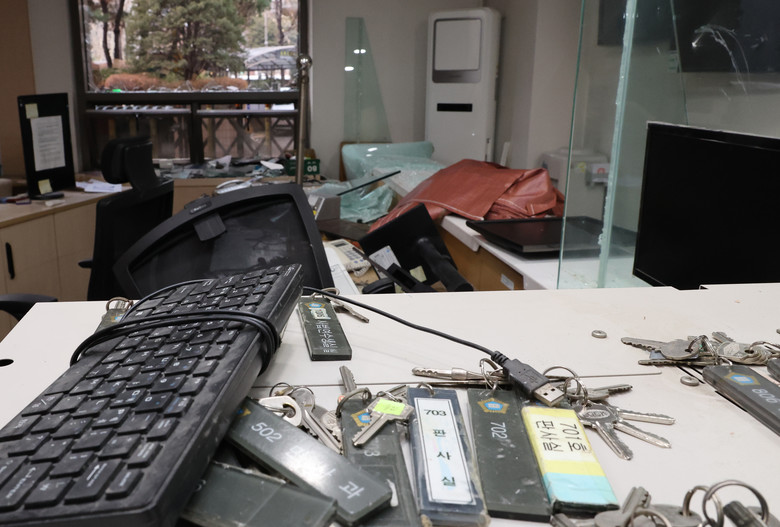 윤석열 대통령이 내란 우두머리 혐의로 구속되자 일부 윤 대통령 지지자들이 서울서부지방법원 내부로 난입해 불법폭력사태를 일으킨 19일 오후 서부지법 내부의 한 사무실과 집기류 등이 파손돼 있다. 2025.1.19