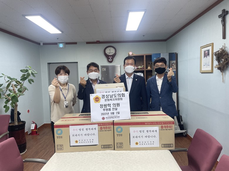 [경남 세계타임즈=최성룡 기자] 경상남도의회 문화복지위원회 부위원장 정쌍학 의원(국민의힘, 창원10)은 추석명절을 맞아, 2일‘마산종합사회복지관’, ‘마산장애인복지관’ 등 사회복지시설 2개소를 방문하여 시설 이용자와 종사자들을 격려하며 따뜻한 명절분위기 조성에 나섰다.