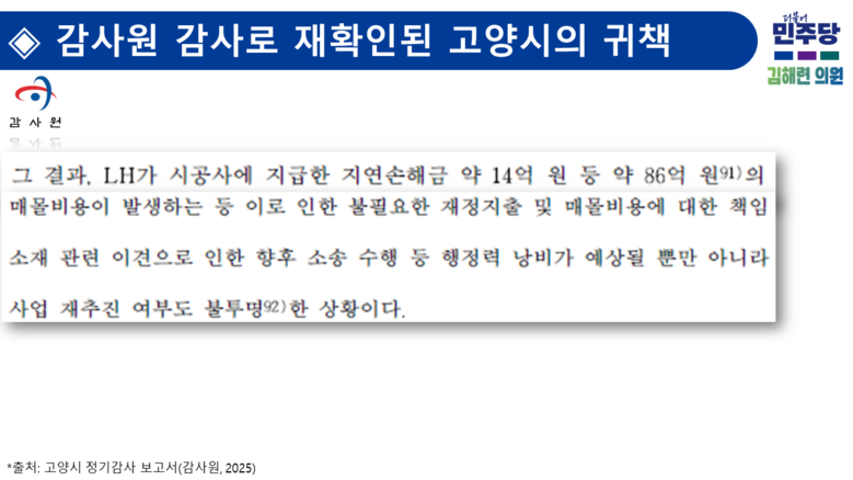 김해련 의원은 제275회 시정질문, 제298회 및 제301회 5분 자유발언을 통해 “LH가 비교적 합리적인 대안을 제시했음에도, 고양시가 철도시설물의 사업부지 침범 등 공사 중지 사유와 별개로 불필요한 사업계획 변경을 요구하면서 사업을 의도적으로 지연시킨 점은 고양시의 명백한 잘못이며, 이에 따라 최소 86억 상당의 매몰 비용, 소송 패소 시 최대 200억의 시 재정 손실을 발생시킬 수 있다”고 지속적으로 경고해 왔다.