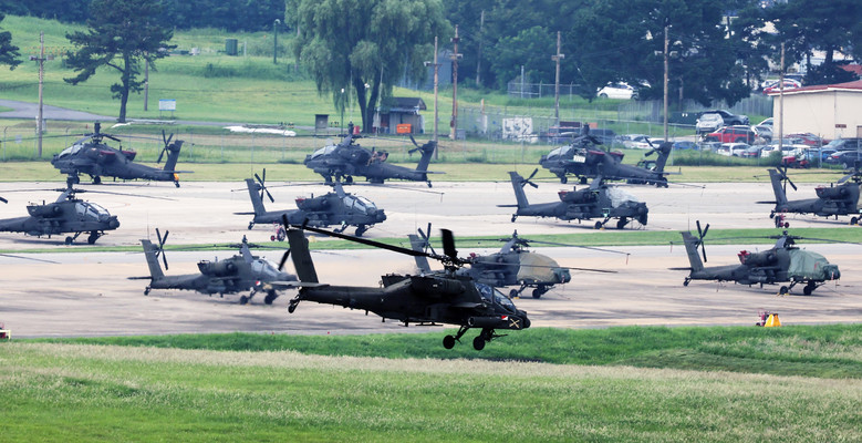 한국과 미국이 유사시 한반도 방어를 위한 정례 연합 훈련인 '을지 자유의 방패'(UFS·Ulchi Freedom Shield) 연습을 이달 19∼29일 실시한다고 밝힌 12일 경기도 평택시 캠프 험프리스에서 아파치 헬기가 비행하고 있다.UFS 기간 군사 훈련과 함께 진행되는 정부 연습 중 북한의 핵공격 상황을 가정한 북핵 대응 훈련이 실시된다고 합참은 전했다. 2024.8.12