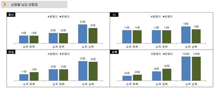 소득 수준에 따라 하위/중위/상위 그룹으로 분류하여 분석한 결과, 소득 하위 그룹은 오히려 외벌이 가정이 더 많은 보험료를 납입했다. 한화생명이 분류한 소득 하위 기준은 연 소득으로 맞벌이는 7천만원 이하 및 외벌이는 4천만원 이하였는데, 종신보험 15만원 및 CI보험 14만원으로 보험료가 동일했다. 심지어 연금보험은 맞벌이(11만원)보다 외벌이(15만원)가 더 많이 냈으며, 저축보험은 맞벌이(20만원)보다 외벌이(25만원)가 더 많았다.