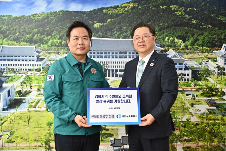 성금 전달을 위해 경북도를 방문한 박일준 대한상의 상근부회장은 경북지역 산불 피해현황을 듣고 “삶의 터전을 잃은 이재민들에 깊은 위로의 말씀을 드린다”며 “지역 주민들이 하루빨리 안정을 찾고 일상으로 복귀할 수 있기를 진심으로 바란다”고 말했다.