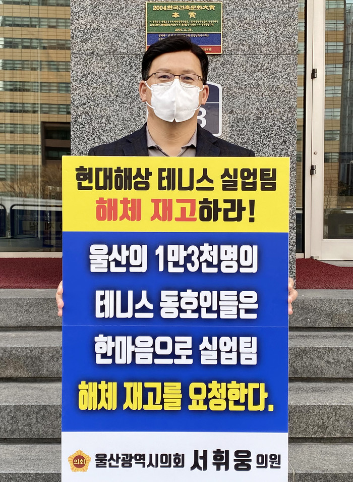서휘웅 의원은 1인 시위에서 “전국체전에서 울산 대표로 출전하는 현대해상 테니스 실업팀은 내년이면 창단 40주년을 맞는, 사실상 울산 연고팀”이라며, “내년 전국체전을 앞둔 울산의 입장에서 해체는 있을 수 없는 일이다.”고 입장을 밝혔다.