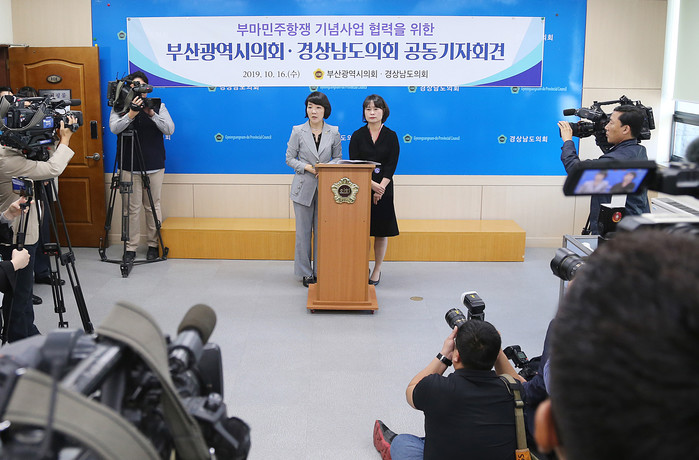 부산시의회(의장 박인영)와 경남도의회(의장 김지수)는 부마민주항쟁 40주년인 16일, 민주정신의 계승과 발전을 위해 「부마민주항쟁 기념에 관한 조례」를 동시에 제정하기로 뜻을 모으고 경남도의회에서 만나 기자회견을 열었다.