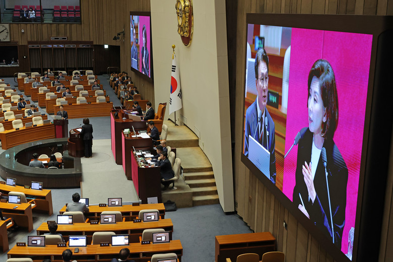 김민석 국무총리가 18일 교육·사회·문화 분야 대정부질문이 열린 국회 본회의장에서 국민의힘 나경원 의원의 질문에 답하고 있다. 2025.9.18
