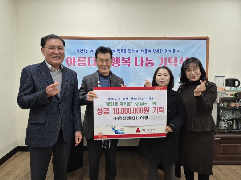 ㈜웅산엔지니어링은 2022년부터 매년 연말 계산1동에 1,000만 원씩 성금을 기부해 오고 있으며, 이번 기탁 역시 지역 내 저소득 주민을 위한 복지사업에 사용될 예정이다. 계산1동은 이번 기탁을 계기로 더불어 사는 지역공동체 조성에 긍정적인 효과가 있을 것으로 기대하고 있다.