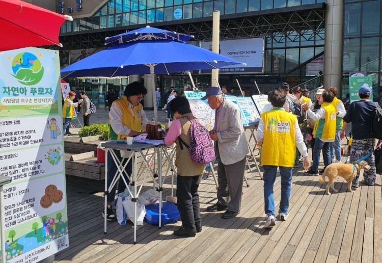 부천지부 20명의 봉사자는 주말을 맞아 ‘EM흙공을 활용한 깨끗한 물 환경 만들기’를 주제로 부천시 북부역 광장에서 자연아 푸르자 캠페인을 진행했고 160여 명의 시민이 참여했다.