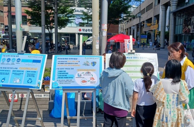 ▲지난 18일 부천 북부역 광장에서 신천지자원봉사단 부천지부가 진행한 ‘깨끗한 물 환경캠페인’에서 시민들이 봉사자에게 일회용품 분해 기간에 대해 도슨트를 듣고 있다.