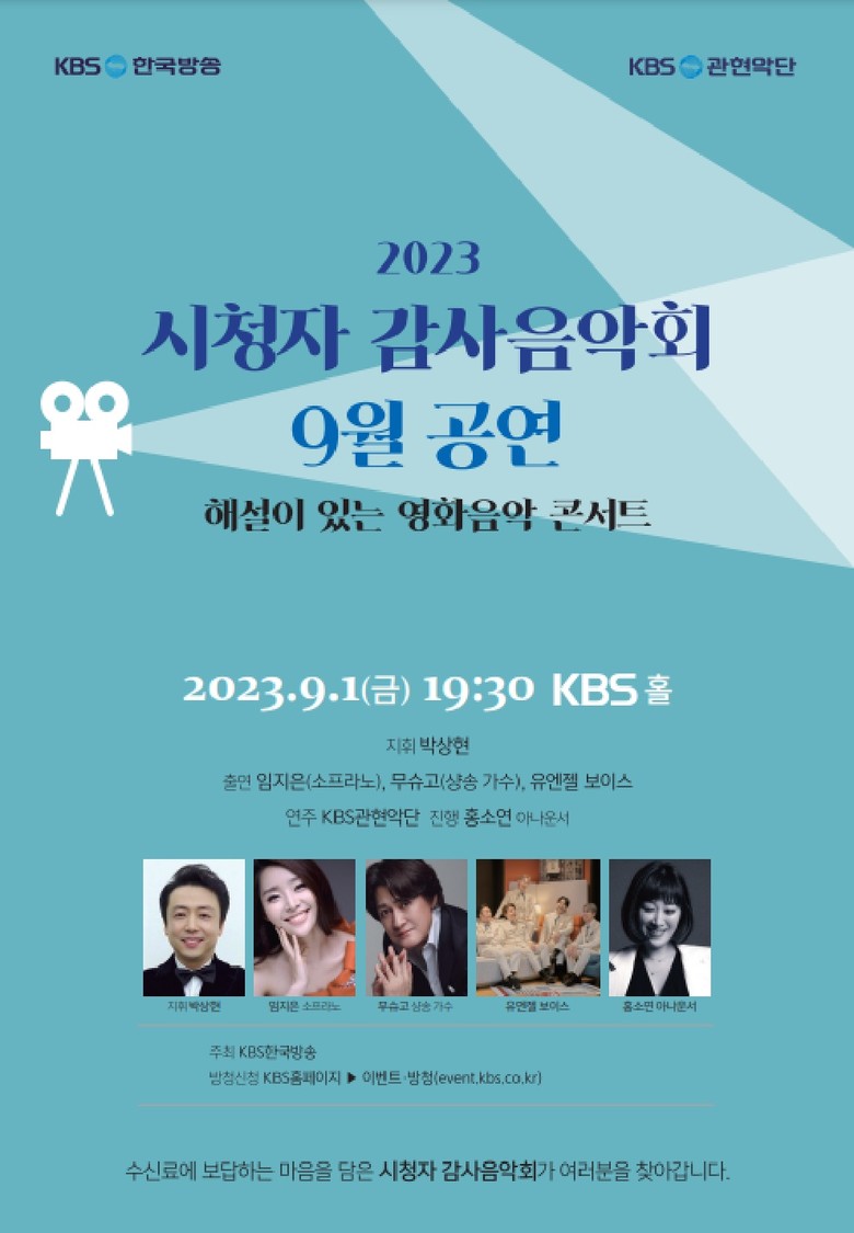 KBS 9월 1일 금요일 저녁 7시 30분 여의도 KBS홀에서 <2023 시청자 감사음악회> KBS관현악단 9월 공연 ‘해설이 있는 영화음악 콘서트’를 개최한다.