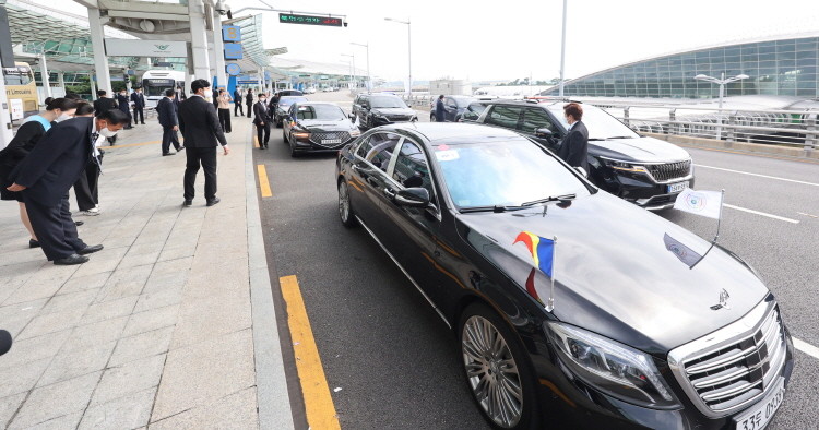 [세계타임즈 = 백진욱 기자] 에밀 콘스탄티네스쿠 루마니아 전 대통령이 16일 오전 HWPL이 주최하는 9·18 평화만국회의 제9주년 기념식에 참석하기 위해 인천국제공항을 통해 입국한 가운데, HWPL 공항영접부와 의전차량부의 의전을 받으며 차량에 탑승 후 이동하고 있다.