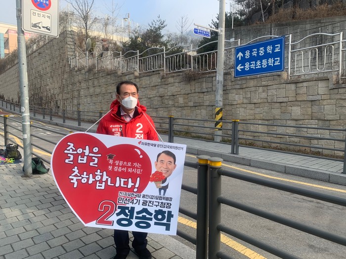 | ▲정송학 예비후보가 피켓을 들고 졸업축하 인사를 하고 있어 이채롭다. |