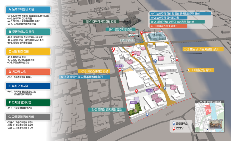 생활환경 정비 사업도 병행한다. 낡고 파손된 마을안길을 정비하고, 보행자 안전을 위한 보도와 가로 시설물을 개선한다. 이를 통해 골목 환경 개선은 물론 아동 양육 가정을 지원하기 위해 보육과 생활 인프라를 확충하게 된다.