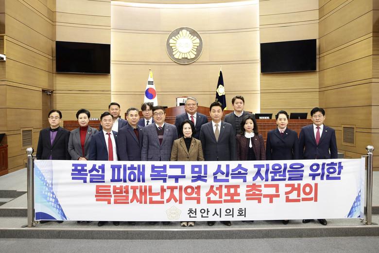 천안시의회는 건의문을 통해 11월에 내린 폭설로 인하여 천안시 농촌 지역에 막대한 피해가 발생하였다며 △특별재난지역 지정 △정부의 조속한 복구계획 및 피해보상 대책 마련 △피해 예방을 위한 조기 예고 및 재해보험 확대 등을 촉구했다.