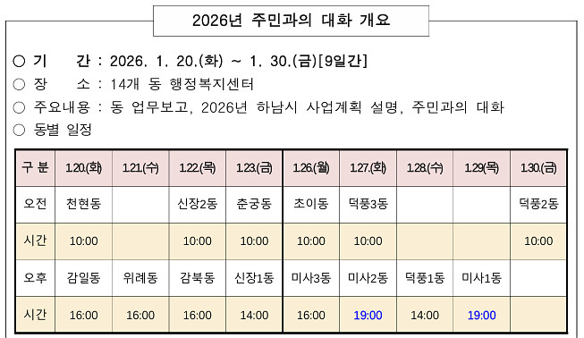 순회 일정은 1월 20일 천현동과 감일동을 시작으로 관내 14개 동 전체를 방문하며 진행된다. 시는 더 많은 시민의 참여를 보장하기 위해 지난 1월 9일부터 일반 시민 참여자 모집을 진행 중이다.