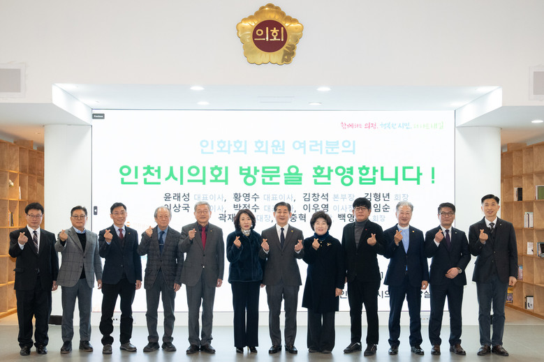 정해권 의장은 13일 김형년 인천시재향군인회장, 곽재은 317방첩부대장, 최충혁 한국산업단지공단 인천지역본부장, 백영순 한국여성경제인협회장, 서임순 전(前) 한국여성경제인협회장, 이우영 로이교육재단 이사장, 이상국 삼광조선공업㈜ 대표이사, 김창석 수협중앙회 경인금융본부장, 박정수 ㈜제이아이티 대표이사, 황영수 ㈜삼우통상 대표이사, 윤래성 한성운수㈜ 대표이사 등 인화회 회원 총 11명을 의회로 초청해 시의회를 소개하고, 본회의장 등 시설들을 둘러봤다.