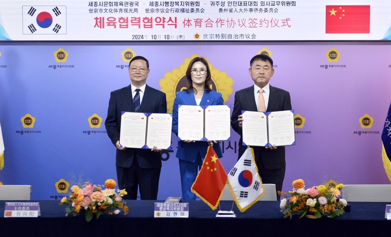 이날 양 도시의 체육 교류 협약식에는 세종시의회 김현미 행정복지위원장과 구이저우성 인민대표대회 외사교무위원회 샤오샹양 위원장, 세종시 김려수 문화체육관광국장이 각 기관의 대표로 참석해 협약서에 서명했다.