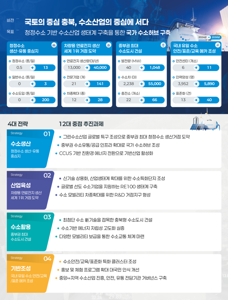 한편, 충북도는 2018년 11월 전국 최초로 수소산업육성 지원조례를 제정하고 2019년 충청북도 수소산업육성 1차 기본계획 수립을 통해 24년까지 수소 생산, 수소 모빌리티 시스템, 수소안전/표준화와 관련된 24개 사업, 약 6,700억 규모의 사업을 추진하고 있다.