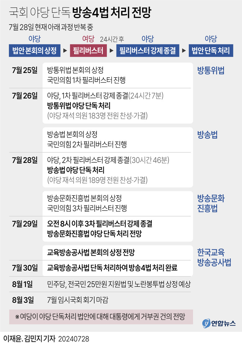 강 의원은 민주당이 겉으로는 검찰 공화국이라고 윤석열 정부를 공격하고 민생을 외치면서도 정작 목을 매는 것은 방통위원장 연쇄 탄핵 및 언론노조를 통한 공영방송 이사진 장악이라고 지적했다.민주당의 속내는, 임기가 끝나가는 MBC 이사장을 사수해 MBC를 계속해서 민주당 편향방송으로 만들어야 하기 때문이라고도 주장했다.4시간 가까이 찬성 토론 중인 더불어민주당 조계원 의원은 윤석열 정부는 공영방송을 정치 도구화하고 재갈을 물리려 하고 있다고 비판했다.대통령과 여당에 우호적인 인물이 방문진 이사회의 다수를 차지하는 현 구조에서는 때로는 극단적 성향의 인물이 공영방송 사장으로 임명돼 정권의 꼭두각시 역할을 하게 된다고 맞섰다.국민의힘 소속 주호영 국회부의장의 본회의 사회 복귀를 두고도 신경전이 계속됐다.우원식 국회의장은 이날 새벽 방송법 개정안이 통과한 후 주 부의장을 향해 국회의원 주호영이 방송4법 개정에 반대하는 것이 국회부의장 주호영이 직무를 거부하는 이유가 될 수 없다며 사회 거부 의사를 즉각 철회하라고 말했다.주 부의장은 오전 입장문에서 야권이 190석 의석을 앞세워 무제한 토론을 24시간마다 강제 중단시키는 것은 숙의민주주의와 합의민주주의를 파괴하는 폭거라는 생각에 변함이 없다며 사회 거부 의사를 재확인했다.국민의힘 배준영 원내수석부대표는 이날 언론 공지를 통해 이 어려움을 해소하는 방법은 간단하다. 오로지 국회의장의 결정에 달려있다며 운명이 뻔히 정해진 법안에 대해서는 상정 안 하시면 된다고 거들었다.이날 오전 1시 8분께 시작된 방문진법 필리버스터는 29일 오전 8시 이후 민주당 주도로 표결을 거쳐 강제 종료될 예정이다.국회법상 필리버스터는 24시간이 지나면 표결을 통한 강제 종료가 가능한데, 민주당은 전당대회 지방 일정을 고려해 29일 오전 8시 본회의장 집결을 계획하고 있다. 민주당은 이날 오전 8시 방문진법 개정안에 대한 무제한 토론 종결 동의서를 제출했다.야당은 이후 방송 4법 가운데 마지막 남은 교육방송공사법도 이어서 통과시킬 방침이다.필리버스터와 토론 종결이 반복돼 방송 4법의 표결이 모두 완료되는 시점은 30일 이후가 될 것으로 보인다.
