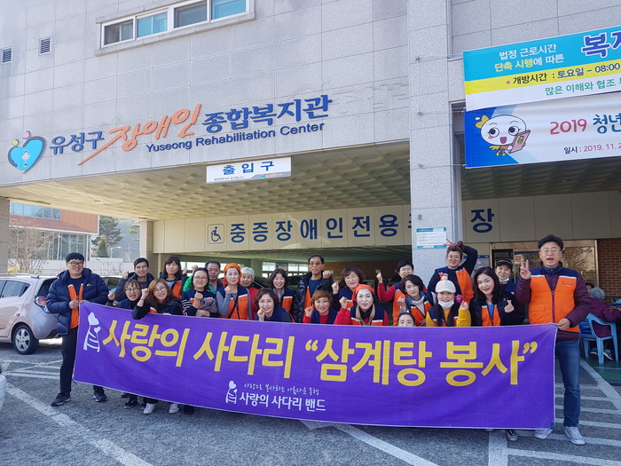 [대전=세계타임즈 이장성 기자] 대전시 SNS 봉사단체 사랑의 사다리 밴드(리더 이정제)는 28일 오전11시, 유성구장애인복지관(관장 김영근)에서 삼계탕 300그릇 봉사로 우리사회의 따뜻한 사랑을 전달하였다.