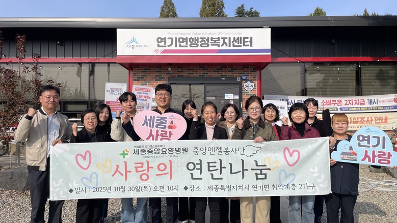 특히 세종중앙요양병원 직원들은 연기면 복지사각지대 2가구를 직접 방문해 사랑의 연탄을 배달하며 나눔의 온기를 더했다.