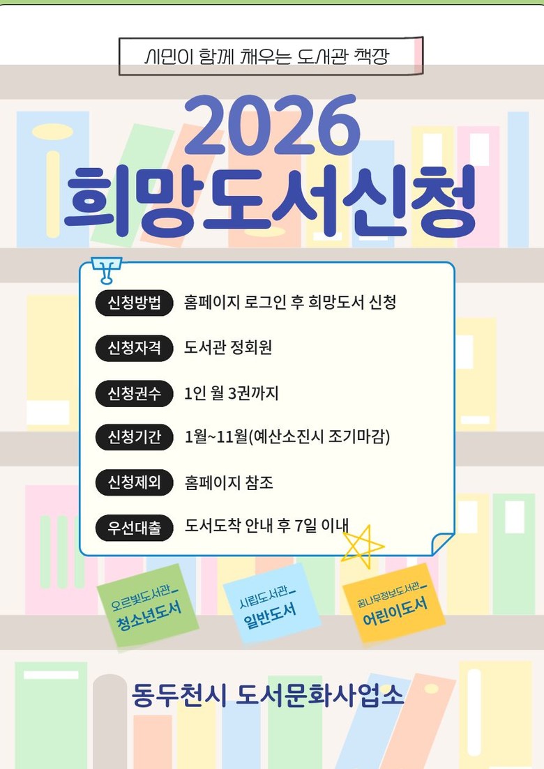 ○ 시민이 원하는 장서 구성 및 독서 활동 지원 [세계타임즈=동두천시 송민수 기자] 동두천시 도서문화사업소는 새해를 맞아 시민들의 독서 활동을 지원하기 위해 희망도서 신청 서비스를 재개한다고 밝혔다.