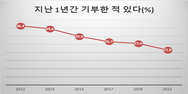 <표 1>‘지난 1년 간 기부 경험이 있다’(통계청 사회조사, 2021.5.)