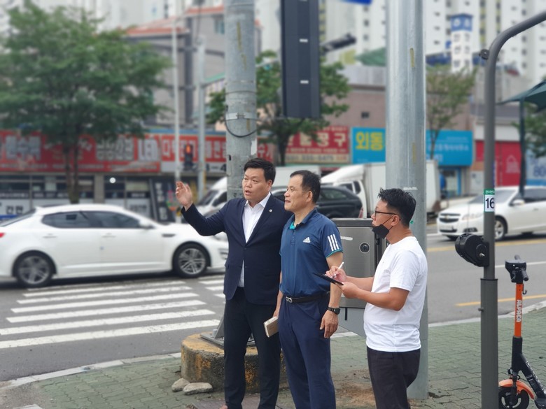 | ▲ 이시영 도의원을 비롯한 관계자들이 20일 오후 김해 외동사거리 현장을 둘러보고 있다. |