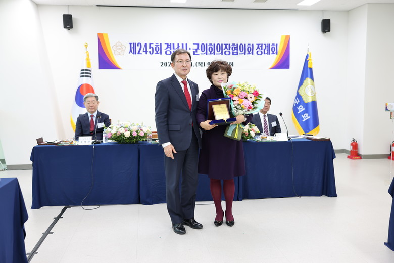 [의령군 세계타임즈=최성룡 기자] 의령군의회 오민자 의원이 지난 21일 의령군에서 열린 ‘경남 시·군의회의장협의회 제245회 정례회’에서‘경상남도 의정봉사상’을 수상했다.