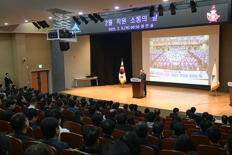 최민호 시장은 6일 시청 여민실에서 직원 300여 명이 참석한 가운데 열린 2월 직원 소통의 날 행사에서 올해 극심한 정치적 혼란이 예상된다며 공직자들이 흔들림 없이 중심을 잡아줄 것을 당부했다.