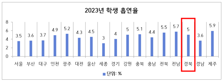 한편 교육부의 자료에 따르면 전국 중·고등학생 흡연율은 점차 감소 추세(‘14년 9.2% → ‘23년 4.2%)에 있고, 경상북도 청소년의 흡연율도