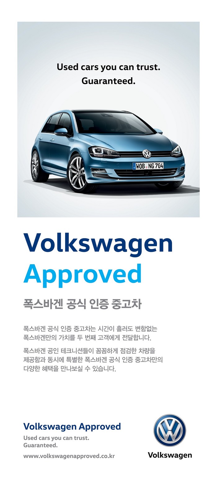 폭스바겐의 공식 인증 중고차 차량 매물은 온라인 쇼룸을 통해 확인할 수 있으며, 각 딜러사가 운영하는 오프라인 전시장에서 구입할 수 있다. 기존에는 마이스터모터스, 클라쎄오토, 유카로오토모빌, 지이오하우스에서 폭스바겐 공식 인증 중고차(VW Approved) 오프라인 전시장을 각각 운영해 왔으며, 지엔비오토모빌이 대구 전시장을 오픈하면서 폭스바겐코리아의 총 5개 딜러사가 5개 공식 인증 중고차 전시장을 운영하게 된다.