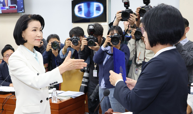 이진숙 방송통신위원장이 7일 오후 국회 과학기술정보방송통신위원회의 국정감사에서 최민희 위원장에게 증인선서문을 전달 후 악수를 먼저 청하고 있다.