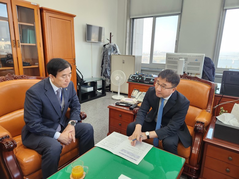 | ▲ 왼쪽 조길형 시장이 오른쪽 신동욱 법제사법위원회를 만나 예산 반영 면담을 하고 있다 |