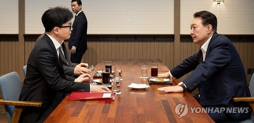 윤석열 대통령이 21일 서울 용산 대통령실 앞 파인그라스에서 국민의힘 한동훈 대표를 만나 대화하고 있다. 2024.10.21 [대통령실 제공]