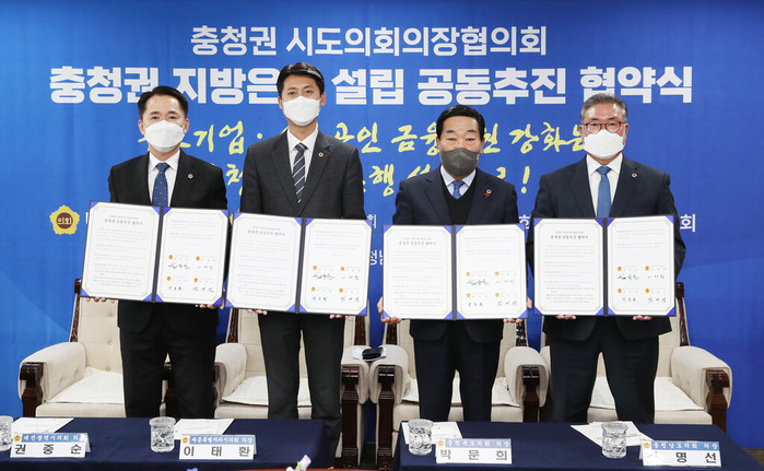 이날 협약식에는 박문희 충북도의회의장, 권중순 대전시의회의장, 이태환 세종시의회의장, 김명선 충남도의회의장이 참석해 금융분권 실현과 중소기업·소상공인 금융지원 강화를 위해 충청권 지방은행 설립을 충청권 4개 시도의회가 공동 노력하기로 합의했다.