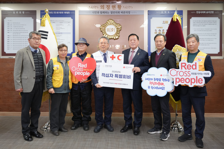 [안성시 세계타임즈=송민수 기자] 안성시의회(의장 안정열)는 19일 대한적십자 경기도지사에 2026년 적십자 특별회비를 전달하며 긴급구호 및 따뜻한 이웃나눔 활동에 동참을 하였다.
