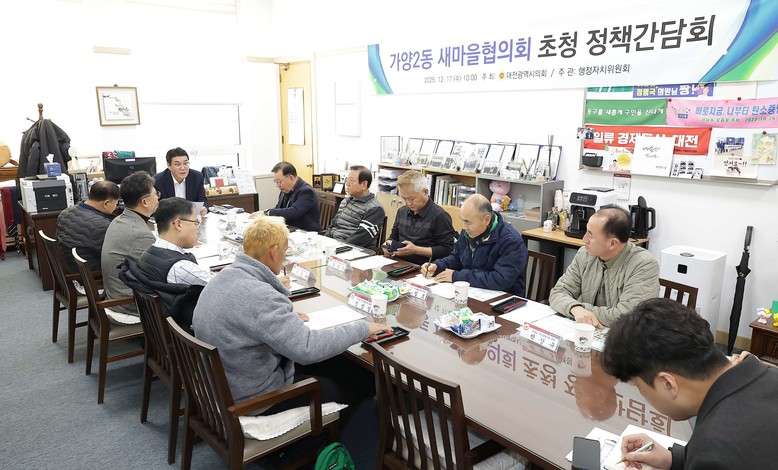 [대전 세계타임즈=이채봉 기자] 대전시의회는 17일 대전시의회 행정자치위원장실에서 정명국 의원(국민의힘, 동구 3) 주재로 가양2동 새마을협회의회 초청 정책간담회를 개최했다.