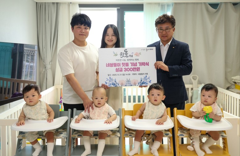 [대덕구 세계타임즈=송민수 기자] 대전 대덕구(구청장 최충규)는 21일 2024년 9월 건강한 네쌍둥이를 출산한 정재룡·가미소 부부가 자녀들의 첫돌을 맞아 특별한 나눔을 실천했다고 밝혔다.