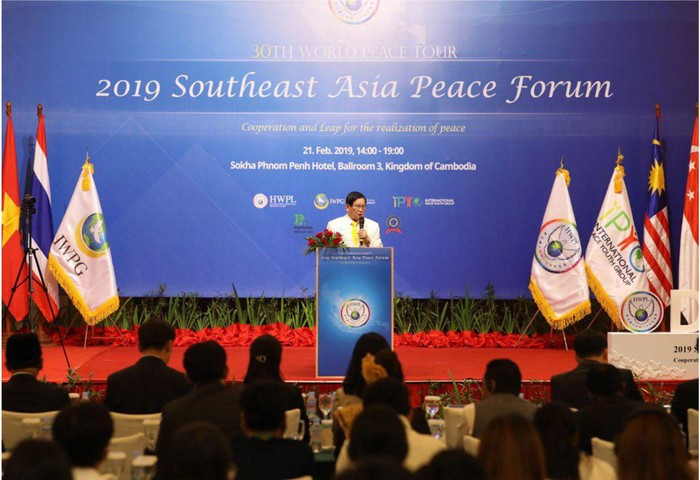 [세계타임즈 이광원 기자] (사)하늘문화세계평화광복(대표 이만희‧이하 HWPL)이 21일(현지시간) 캄보디아 프놈펜 속하 호텔에서 ‘2019 동남아시아 평화포럼’을 열고 동남아 고위지도자들을 향해 세계평화 실현을 위해 DPCW(평화 국제법)을 지지할 것을 호소했다.
