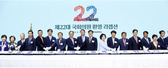 [세계타임즈 = 이채봉 기자] 제22대 국회가 개원한 지 나흘 만인 3일 사상 최대 규모의 정·재계 소통의 장이 열렸다.대한상공회의소는 여의도 콘래드호텔에서 추경호 국민의힘 원내대표, 박찬대 더불어민주당 원내대표, 조국 조국혁신당 대표, 이준석 개혁신당 초대 대표 등 여야 지도부를 포함한 국회의원 100여명이 참석한 가운데 '제22대 국회의원 환영 리셉션'을 열었다.이 자리에는 초선의원도 60명가량 참석했다.경제계에서는 최태원 대한상의 회장, 양재생 부산상의 회장, 박윤경 대구상의 회장, 박주봉 인천상의 회장 등 전국 상의 회장단 70여명을 비롯해 박승희 삼성전자 사장, 이동우 롯데지주 부회장, 신현우 한화 사장, 현정은 현대그룹 회장 등 기업인 350여명이 자리를 함께했다.최태원 회장은 환영사에서 최근 경제 상황을 대표하는 단어를 보면 모두'저(低) 아니면 고(高) 자가 붙는데, 이제는 반대가 됐으면 좋겠다는 생각이 든다며 위기 가운데 기회가 있듯이 그 어느 국회 때보다 더 많은 변화를 만들어 낼 수 있을 것으로 기대한다고 말했다.경제 활력을 되살리는 일, 국민들이 체감하도록 민생을 안정시키는 일, 사회문제의 해법을 찾는 일, 어느 하나 쉽지 않은 과제지만 그런 만큼 국회의원과 경제인이 함께 더 자주 소통하고 고민해 나가면 좋겠다고 덧붙였다.최 회장은 요즘 MZ세대 사이 육각형 인재라는 말이 도는데, 모든 역량을 두루 갖췄다는 의미로 해석된다며 국회의원도 위기 극복의 리더십뿐만 아니라 혁신, 소통, 통합과 같은 리더십을 두루 갖춘 육각형 의원으로서 의정 활동을 펼쳐주기를 기대한다고 말했다.리셉션에서는 최 회장이 직접 준비한 전주 합죽선 선물이 눈길을 끌었다. 상의 회장단은 국민과 경제를 우선하는 민의의 전당이라는 글귀를 새겨 넣은 전주 합죽선을 여야 대표에게 전달했다.민생을 살리는 국회, 경제 활력을 높이는 국회가 되기를 희망하는 경제계의 바람을 전주 합죽선에 담았다. 민생의 어려움과 경제계의 애로를 시원하게 날려주기를 당부드린다는 내용의 편지를 함께 담았다.대한상의는 기업 현장과 대한상의 소통플랫폼을 통해 취합한 제22대 국회에 바라는 경제계 입법과제를 각 정당 대표와 국회의원에게 전달했다.입법과제에는 미래성장과 투자, 규제개선, 자본시장 육성, 민생·환경 관련 제도개선 등이 담겼다.박일준 대한상의 상근부회장은 전국 73개 상공회의소와 함께 22대 국회와 지속적으로 소통하며, 전국 각지의 민의를 모아 전달해 나가겠다며 기업인들도 경제 최일선에서 신기업가정신을 발휘해 다양한 사회문제를 해결하기 위해 노력하겠다고 말했다.국회의원 환영 리셉션은 새로운 국회의 개원을 축하하고 정·재계의 협력과 소통을 다짐하는 교류의 장으로, 대한상의가 2004년부터 주관해 오고 있다.대한상의가 소통플랫폼을 통해 전 국민 3천여명을 대상으로 설문 조사한 결과, 22대 국회에 가장 바라는 리더십으로 이순신의 위기극복'(26.8%)을 꼽았다. 이어 스티브 잡스의 혁신(19.0%), 링컨의 소통(18.7%), 세종의 섬김(15.3%), 만델라의 통합(11.9%) 등의 순이었다.국회 모습으로는 일하는 국회(19.9%)라는 응답이 가장 많았고, 소통하는 국회(14.2%), 국민을 위한 국회(11.5%)가 뒤를 이었다.