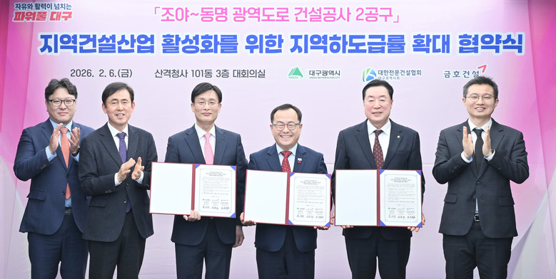 ▸ 지역 하도급·자재·장비·인력 활용 비율 90% 이상 확대 추진 [세계타임즈=대구 한윤석 기자] 대구광역시는 2월 6일(금) 오후 2시 시청 산격청사에서 ‘조야~동명 광역도로건설 2공구’ 공사에 수반되는 하도급의 지역업체 참여 비율 확대를 위해 금호건설㈜, 대한전문건설협회 대구시회와 3자 협약을 체결했다.