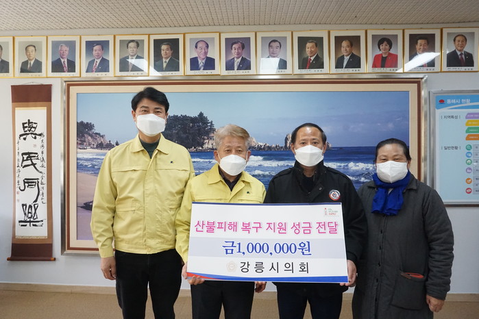 [동해시=세계타임즈 김민석 기자] 강릉시의회(의장 강희문)는 10일 강릉 옥계 산불 발생과 관련, 동해시의회(의장 김기하)를 방문해 동해 산불 피해 복구와 이재민 지원을 위해 써달라며 복구지원 성금 100만원 상당 기탁금을 전달했다.