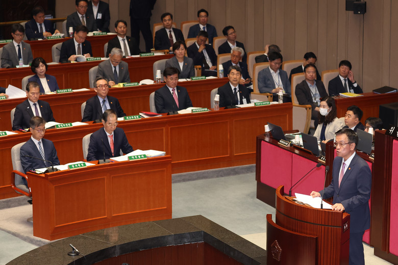 최상목 경제부총리 겸 기획재정부 장관이 2일 오전 국회에서 2023 회계연도 결산심사를 위해 열린 예산결산특별위원회 전체회의에서 보고하고 있다. 2024.9.2