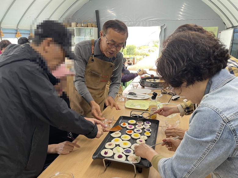 이번 프로그램은 가을이 한창인 계절에 어울리는 제철 꽃인 국화를 이용한 화전 만들기와 꽃차 시음 등의 야외 체험 활동으로 진행되었다. 특히, 치매환자가 직접 식용 꽃을 수확하고 손질하며 오감을 깨우고, 어린 시절 자연 속의 기억 회상을 유도하는 등 인지 건강에도 도움을 주었다.