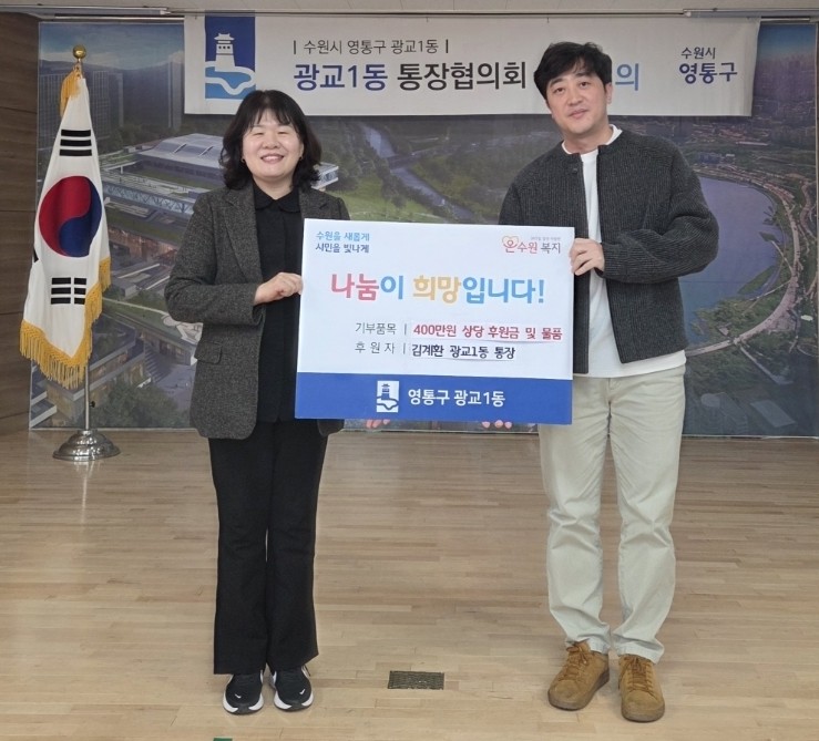 송숙영 광교1동장은 “통장으로서 지역을 위해 항상 헌신해 주시는 김계환 통장님의 따뜻한 나눔에 깊이 감사드린다”며 “기탁해 주신 성금과 물품은 도움이 절실한 이웃들에게 소중히 전달해 실질적인 도움이 될 수 있도록 하겠다”고 말했다. 이어 “광교1동은 앞으로도 주민과 함께하는 나눔 문화 확산과 촘촘한 복지 실현을 위해 최선을 다하겠다”고 덧붙였다.