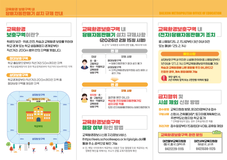 「교육환경 보호에 관한 법률」 개정에 따라 학교 경계로부터 200m 이내인 교육환경보호구역에 설치된 기존 담배 자동판매기는 2029년 2월 14일까지 모두 이전하거나 폐쇄해야 한다.