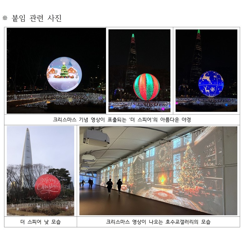 15~31일은 크리스마스 장식품, 신년인 내달 1일~중순은 신년인사 콘텐츠 상영 [송파구 세계타임즈=이장성 기자] 초대형 크리스마스 장식이 석촌호수에 뜬다! 서울 송파구(구청장 서강석)가 ‘게티이미지코리아’와 손잡고 제작한 미디어아트 콘텐츠 6종을 ‘더 스피어’와 ‘호수교갤러리’에서 새롭게 선보인다고 알렸다.