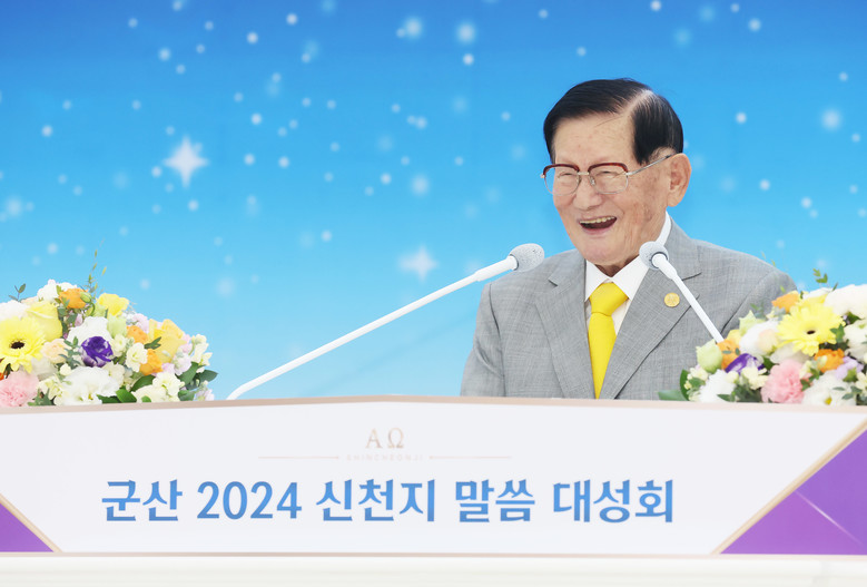 15일 신천지예수교회 이만희 총회장이 신천지 군산교회에서 열린 군산 2024 신천지 말씀 대성회에서 강연하고 있다.