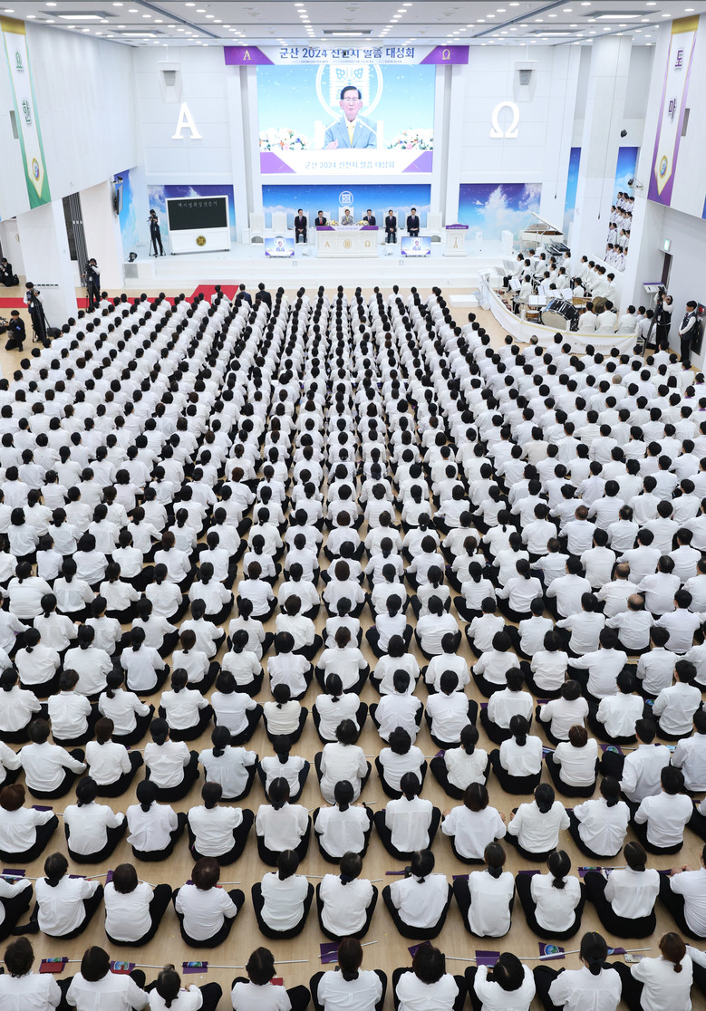 15일 신천지 군산교회에서 열린 군산 2024 신천지 말씀 대성회에 참석한 목회자들이 신천지예수교회 이만희 총회장의 강연을 경청하고 있다.